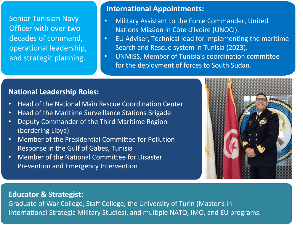 Senior maritime consultant with more than 20 years of operational and strategic service in the Tunisian Navy, specializing in Maritime Domain Awareness (MDA), Search and Rescue (SAR), coastal surveillance, and international coordination.