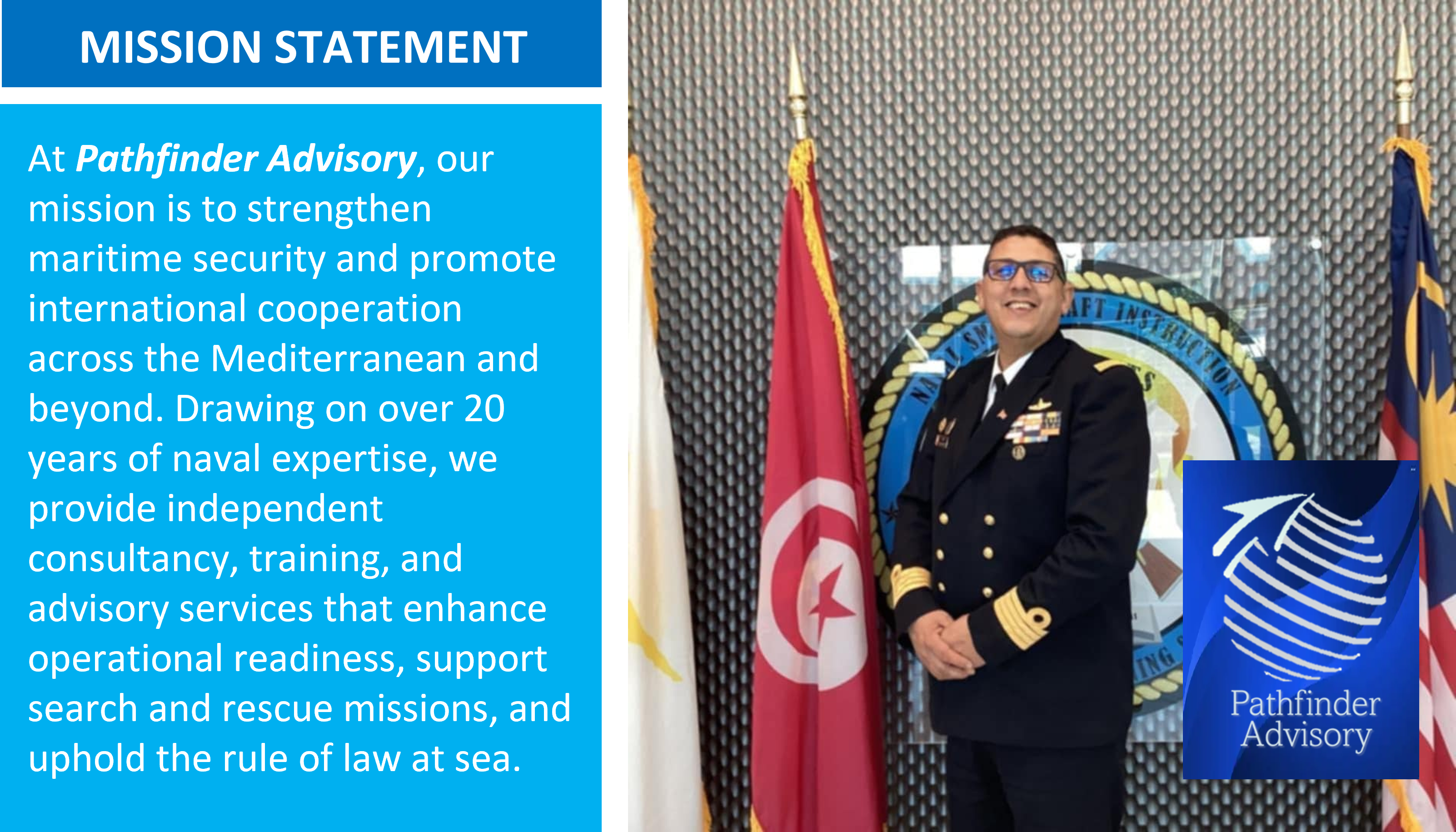 “After more than two decades of service with the Tunisian Navy, I know that the challenges at sea are as vast as the waters themselves. From security threats to rescue missions, every decision can mean saving lives and safeguarding nations. I founded Pathfinder Advisory to share this experience, guide future leaders, and build international cooperation that makes our seas safer for all.”